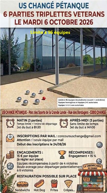 Le club mayennais de l’US Changé Pétanque vous informe de son concours du 6 octobre qui se déroulera dans notre boulodrome ainsi que sous les ombrieres nouvellement construites. Cela va nous permettre d’avoir 84 terrains au total. Les inscriptions commenceront à partir du 24 août.